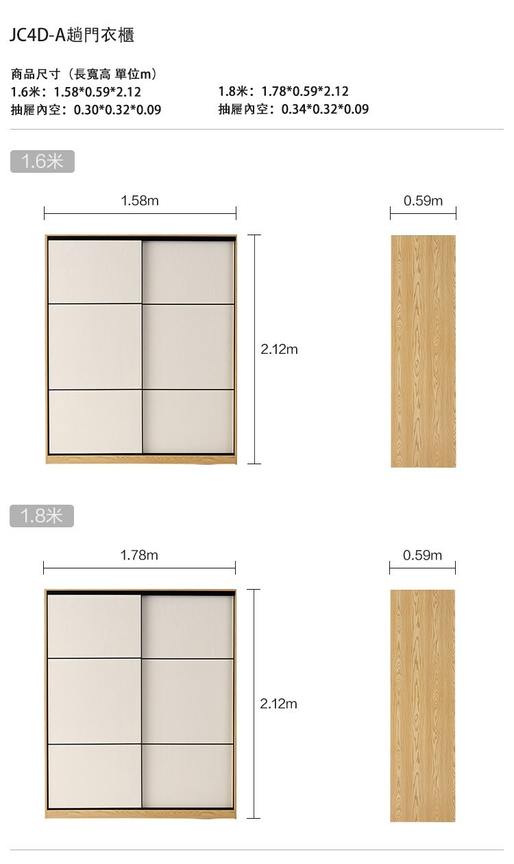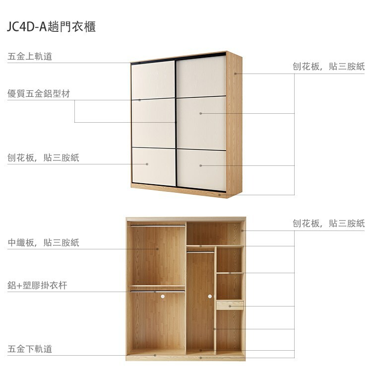 *注意:以下為情境示意圖,實際商品款式為現代簡約黑線滑門1.8M衣櫃 JC4D-A原木色+白色