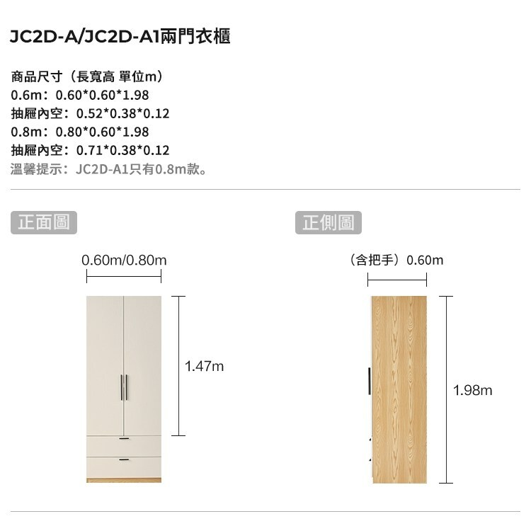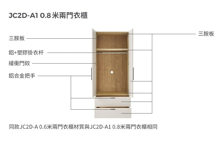 *注意:以下為情境示意圖,實際商品款式為現代簡約0.8M雙門雙抽原木色衣櫃 JC2D-白色
