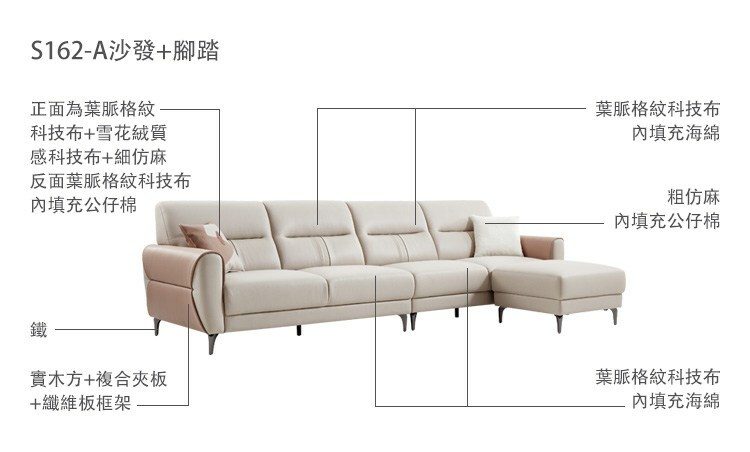 *注意:以下為情境示意圖,實際商品款式為簡約拚色皮感科技布四人沙發+腳踏 S162-初桃色