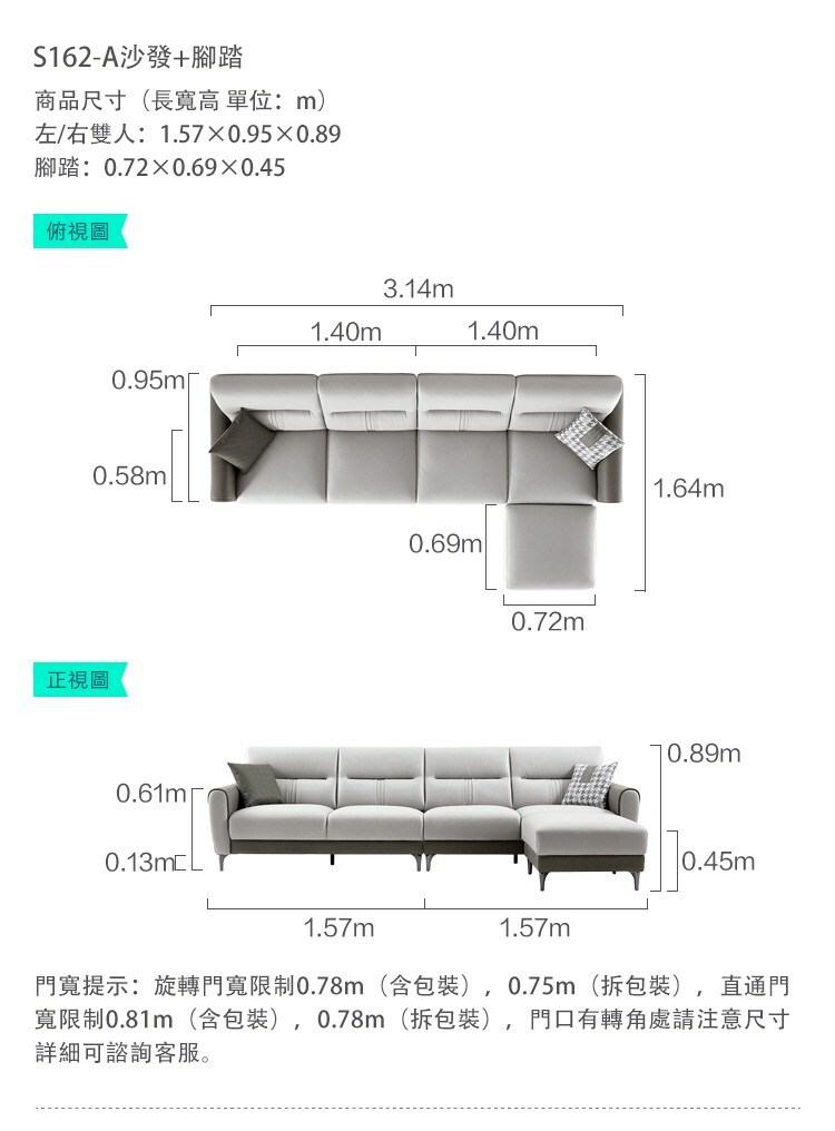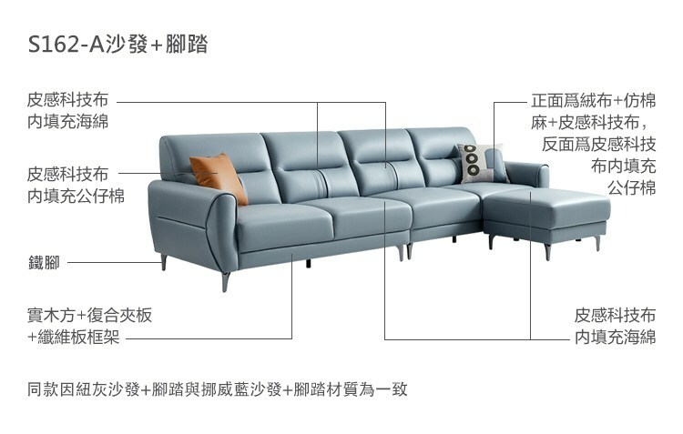 *注意:以下為情境示意圖,實際商品款式為簡約純色皮感科技布四人沙發+腳踏 S162-挪威藍