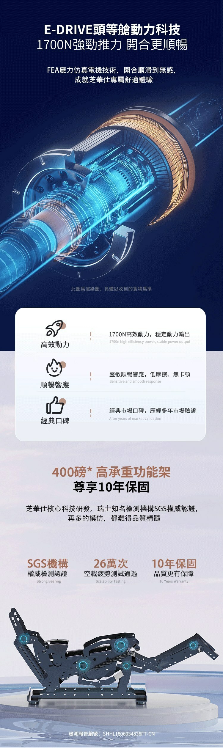 電動馬達保固6年,坐墊海綿保固5年,合金鋼架保固5年,沙發框架保固10年