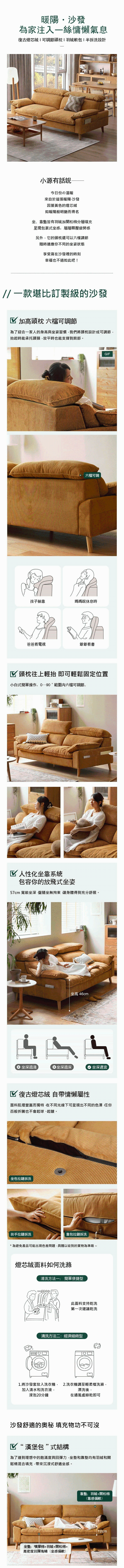 *注意:以下為情境示意圖,實際商品款式為暖陽可調頭枕復古燈心絨加大三人座沙發 S03124 薑黃色