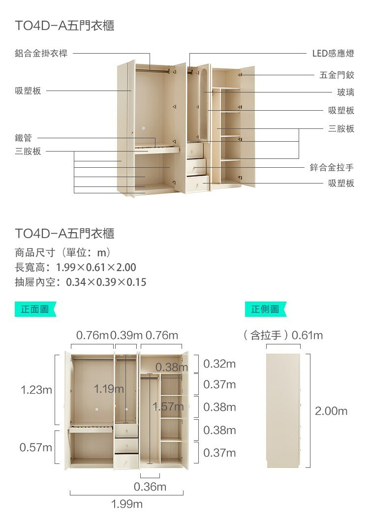 *注意:以下為情境示意圖,實際商品款式為奶糖系列1.99M五門衣櫃 TO4D (附頂櫃)