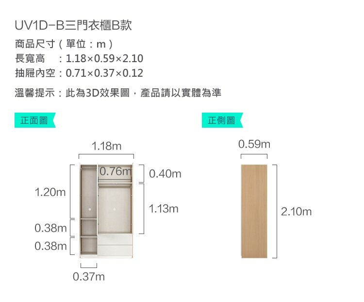 *注意:以下為情境示意圖,實際商品款式為空島三門雙抽衣櫃 UV1D-原木色