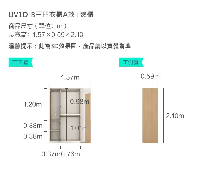 *注意:以下為情境示意圖,實際商品款式為空島三門衣櫃 UV1D-原木色 (附邊櫃)