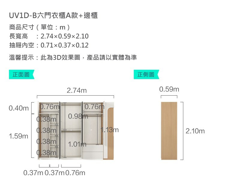 *注意:以下為情境示意圖,實際商品款式為空島六門衣櫃 UV1D-原木色 (附邊櫃)