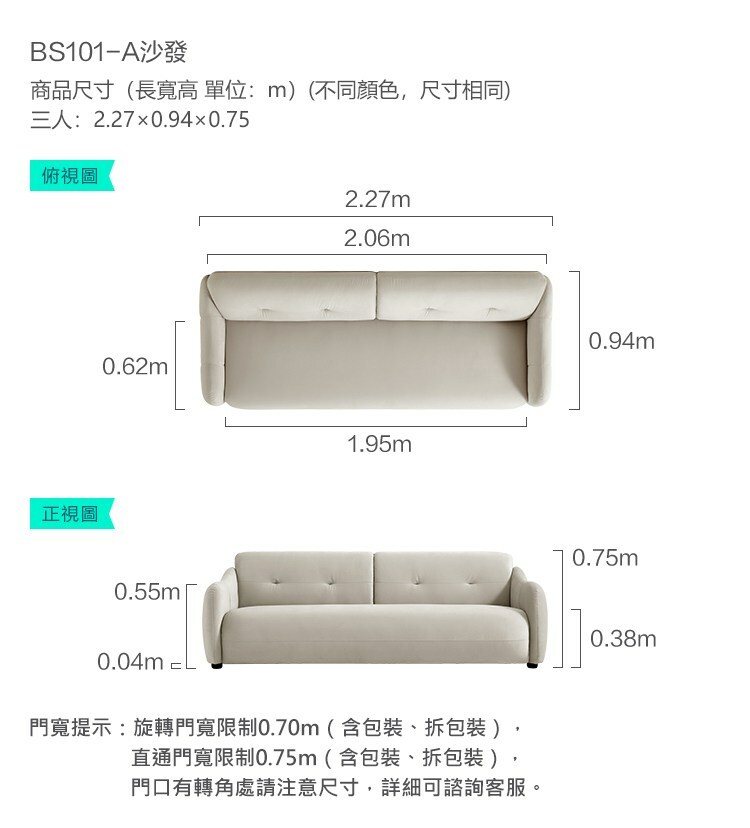 *注意:以下為情境示意圖,實際商品款式為奶油雲朵三人沙發 BS101-淺灰色