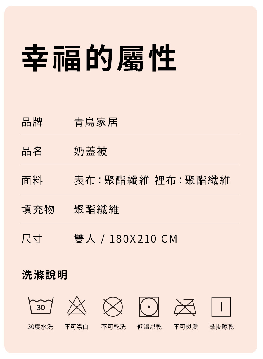洗滌說明:30度水洗、低溫烘乾、懸掛晾乾、不可漂白、不可乾洗、不可熨湯