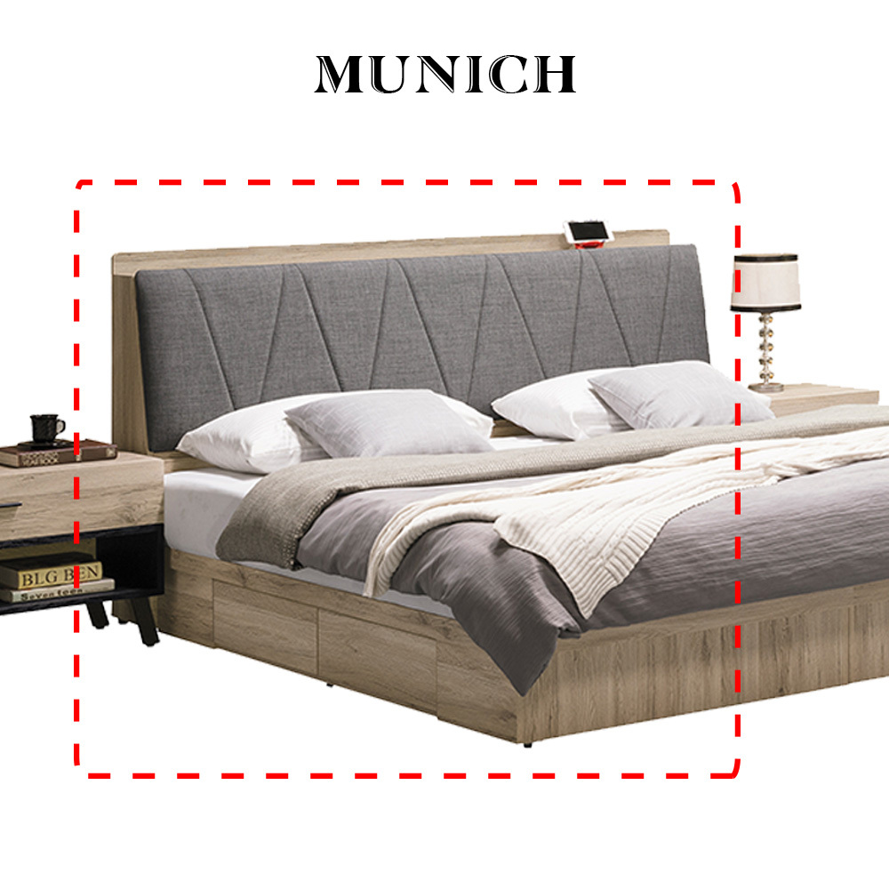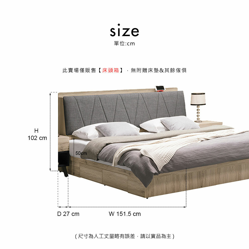 材質: 正面、檯面、側板採用環保木心板專利技術同調木紋鋼刷壓紋,猶如實木質感床頭枕採台灣亞麻布+高密度泡棉,經手工精製車縫處理抽屜採用台灣鋼珠滑軌背板採用美背處理