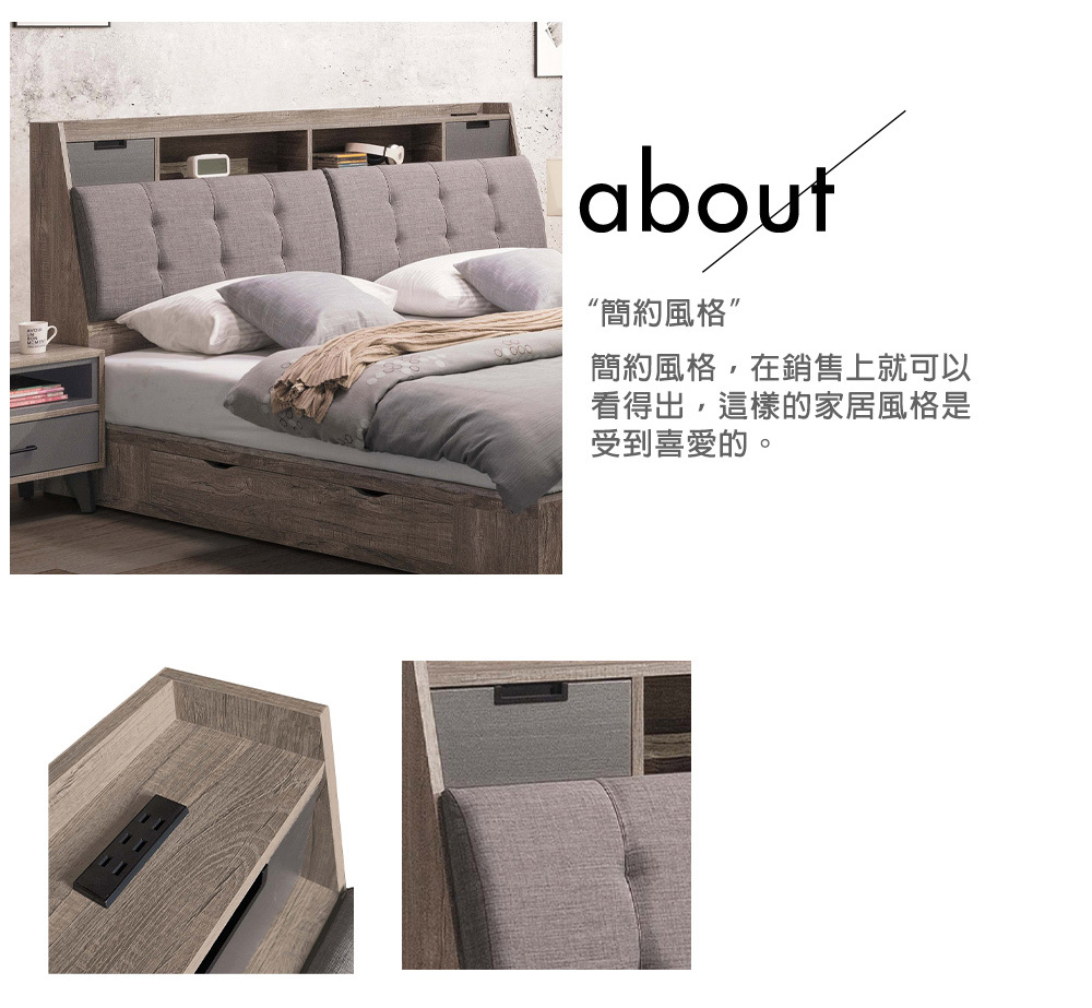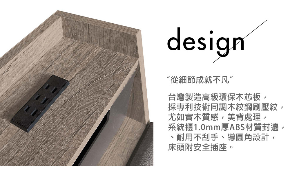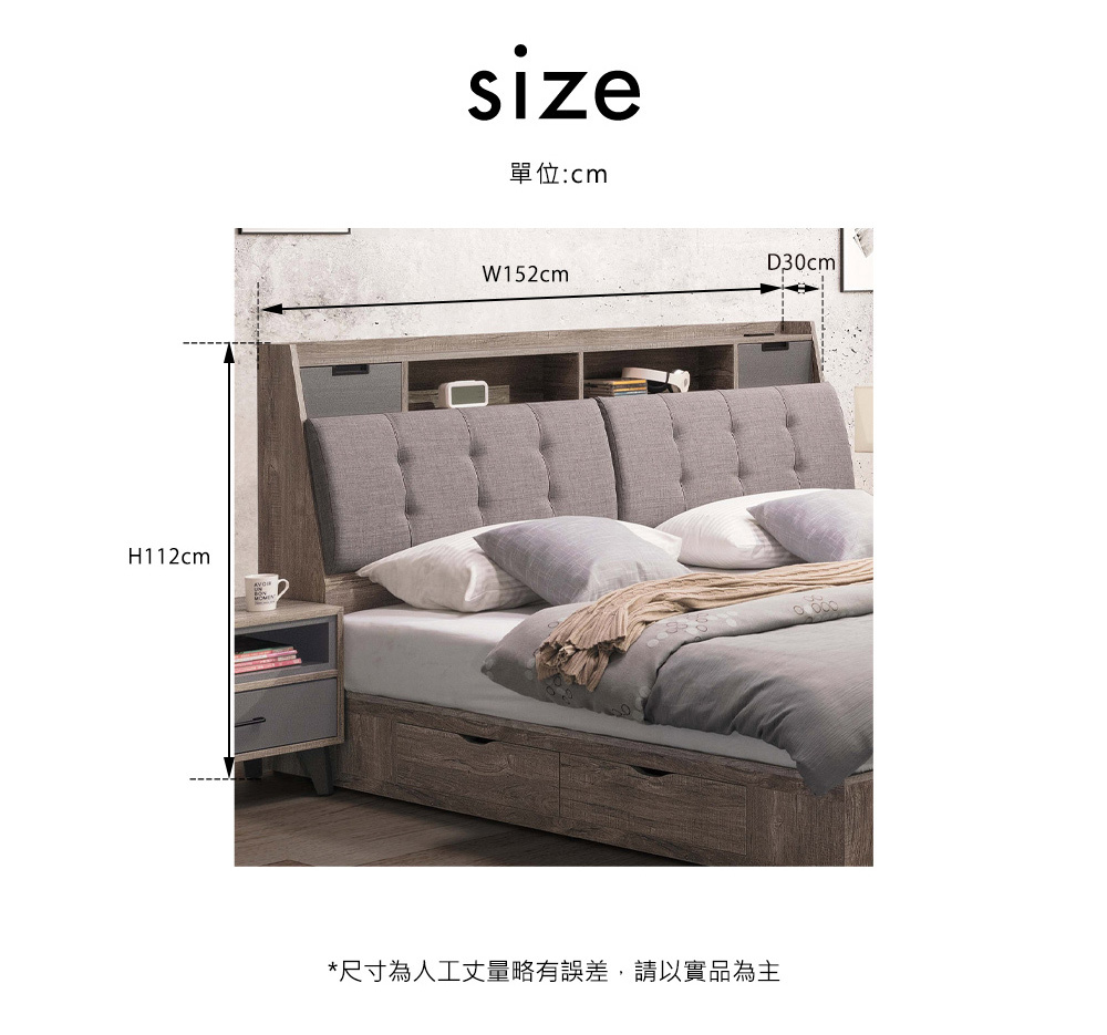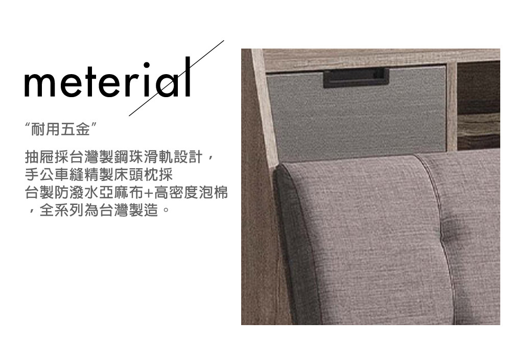 材質: 正面、檯面、側板採用高級環保木心板採專利技術同調木紋鋼刷壓紋,猶如實木質感採用系統櫃1.0mm厚ABS材質風邊處理,質感細緻延長使用週期,具環保(可回收)、耐衝擊、耐磨、高鋼性特質床頭枕採台灣製亞麻布+高密度泡棉,經手工精製車縫處理抽屜採用台灣製鋼珠滑軌,門片採用油壓緩衝鉸鍊背板採用美背處理其它說明: 僅販售標示傢俱,不包含其他飾品。