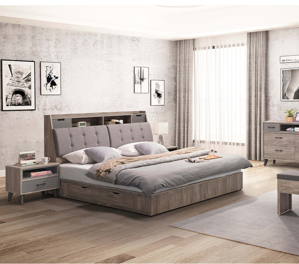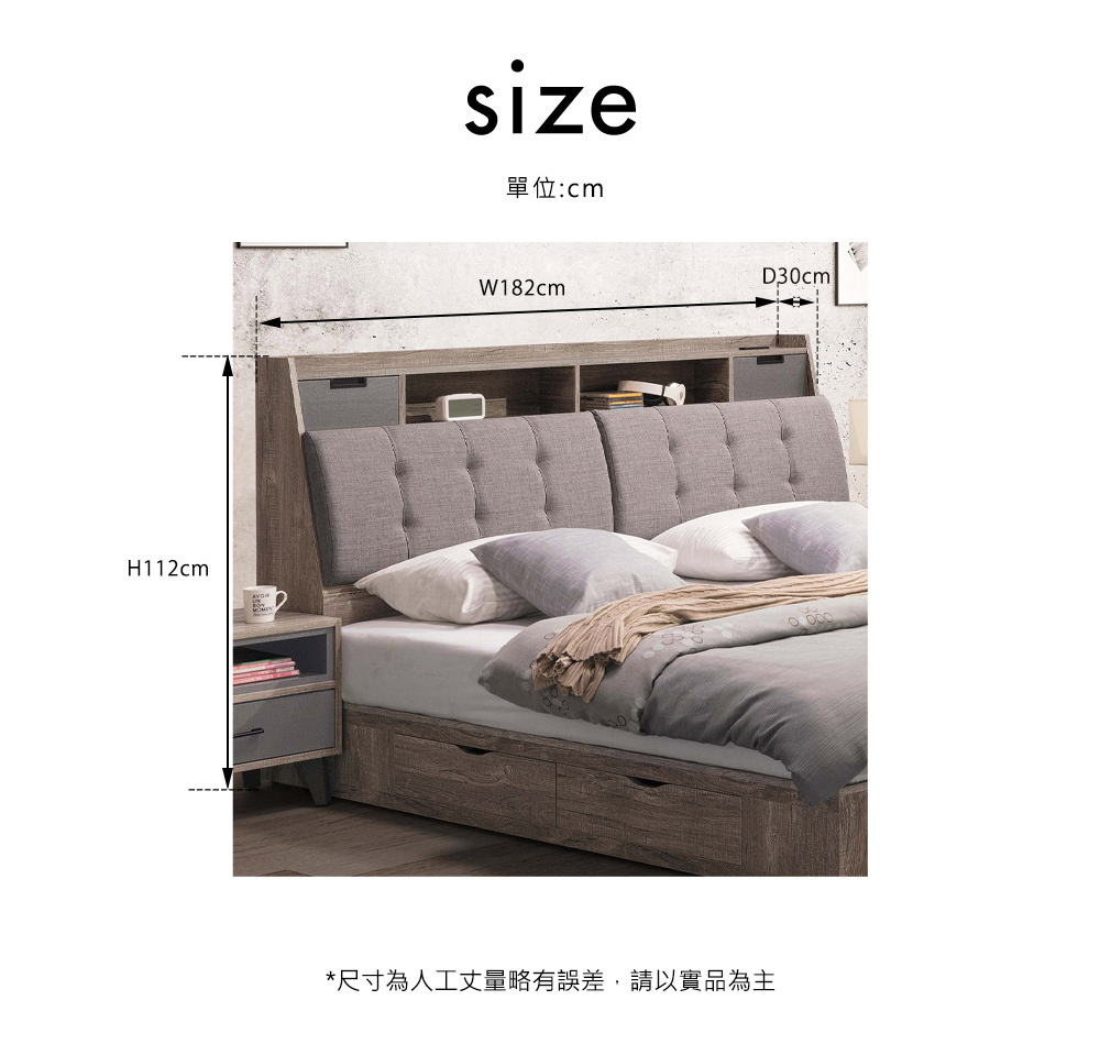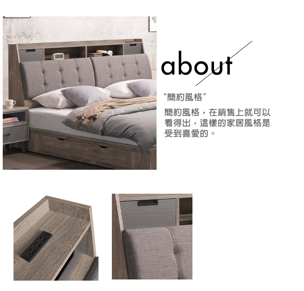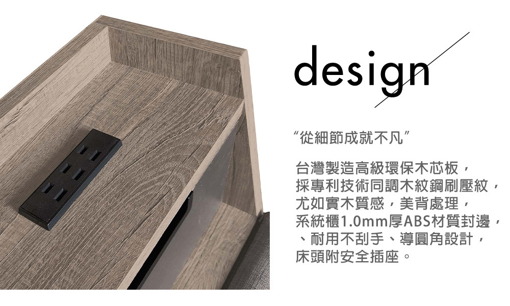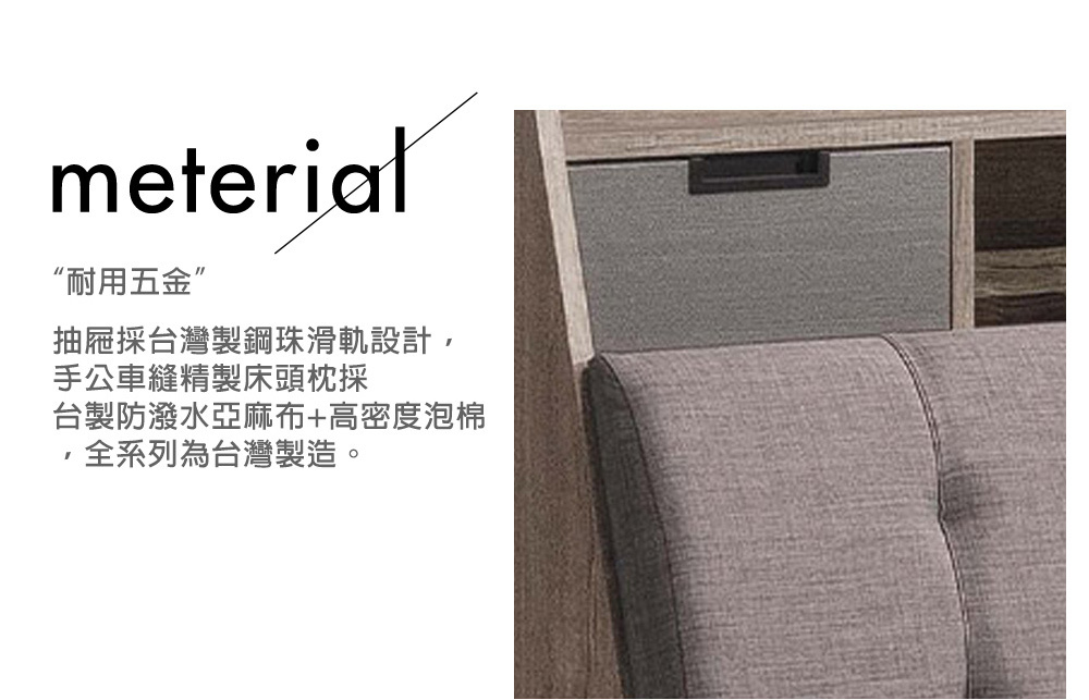 床頭枕採台灣製亞麻布+高密度泡棉,經手工精製車縫處理抽屜採用台灣製鋼珠滑軌,門片採用油壓緩衝鉸鍊背板採用美背處理