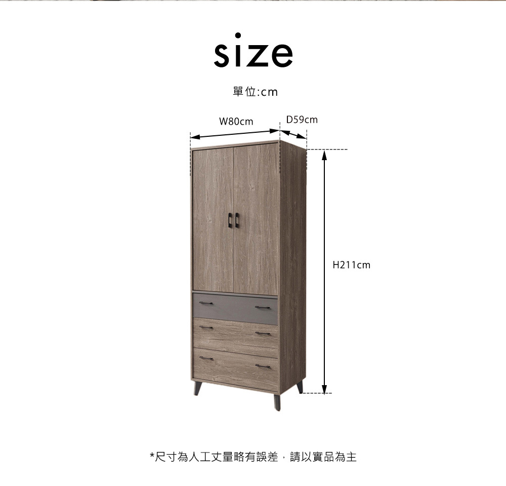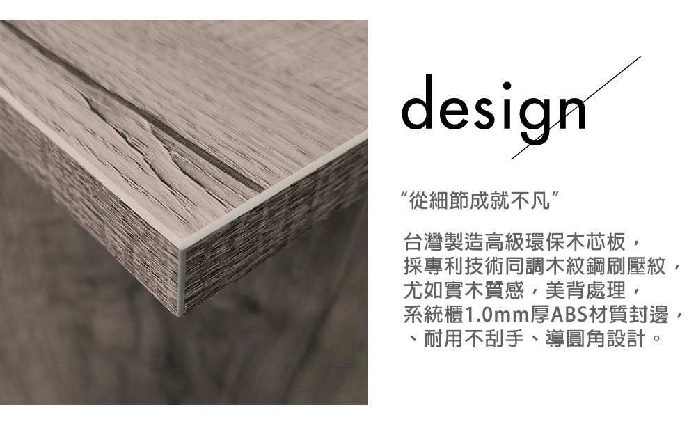 材質: 正面、檯面、側板採用高級環保木心板採專利技術同調木紋鋼刷壓紋,猶如實木質感採用系統櫃1.0mm厚ABS材質風邊處理,質感細緻延長使用週期,具環保(可回收)、耐衝擊、耐磨、高鋼性特質採實木腳座經烤漆處理,黑色金屬把手抽屜採用台灣製鋼珠滑軌,門片採用油壓緩衝鉸鍊背板採用美背處理其它說明: 僅販售標示傢俱,不包含其他飾品。