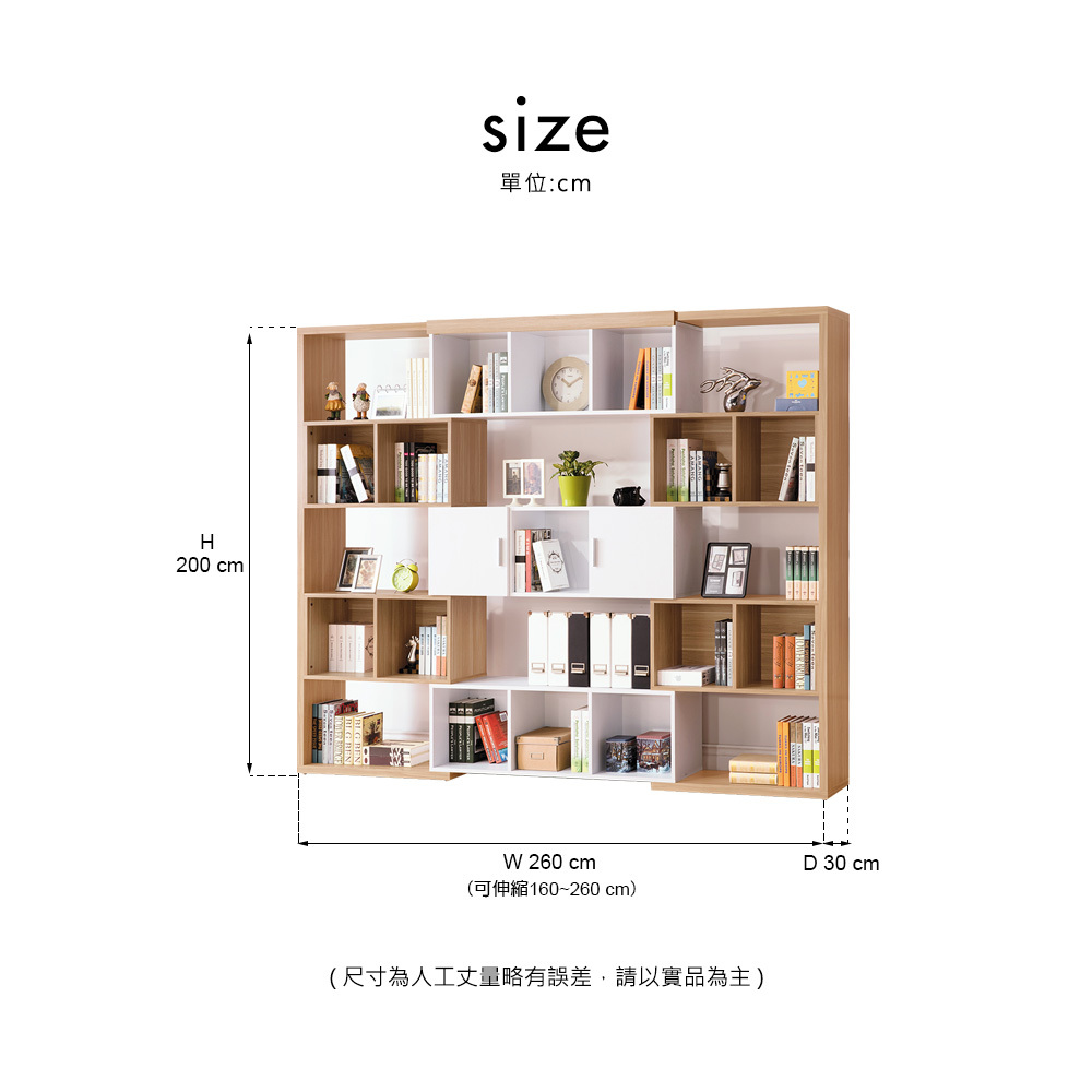 材質: 正面、檯面、側板為環保木心板原木紋耐磨處理書桌附可調金屬腳鋼珠滑軌+美背處理書櫃可160~260cm自由伸縮使用書桌可自由旋轉使用