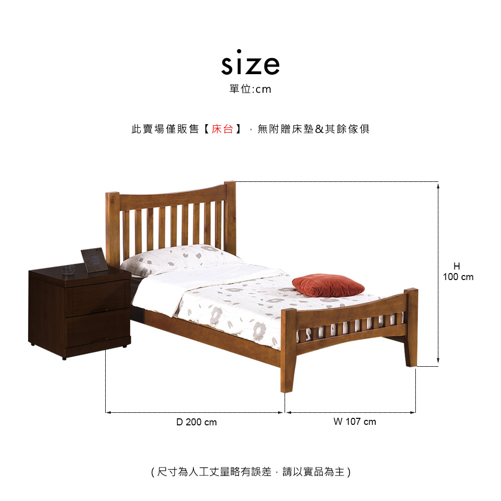 尺寸: 寬107x深200x高100cm(全實木床台、全實木床板)