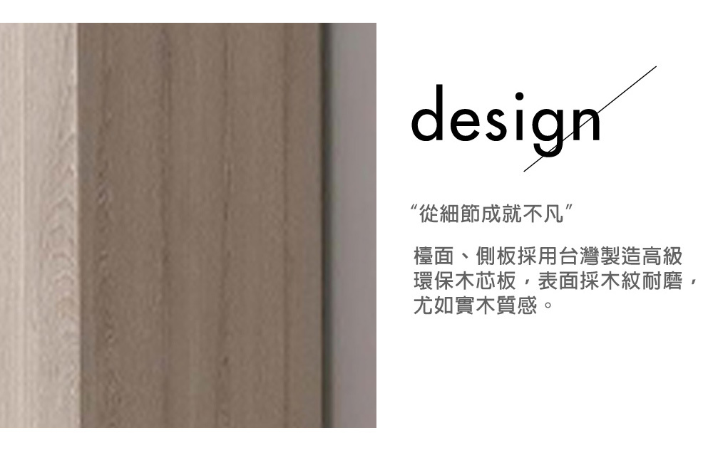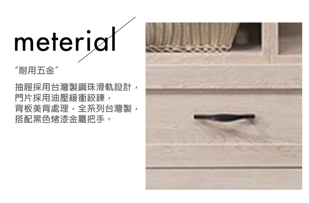 材質: 正面、檯面、側板採用高級環保木心板表面處理採用木紋耐磨,猶如實木質感採黑色烤漆金屬把手抽屜採用台灣製鋼珠滑軌,門片採用油壓緩衝鉸鍊背板採用美背處理其它說明: 僅販售標示傢俱,不包含其他飾品。
