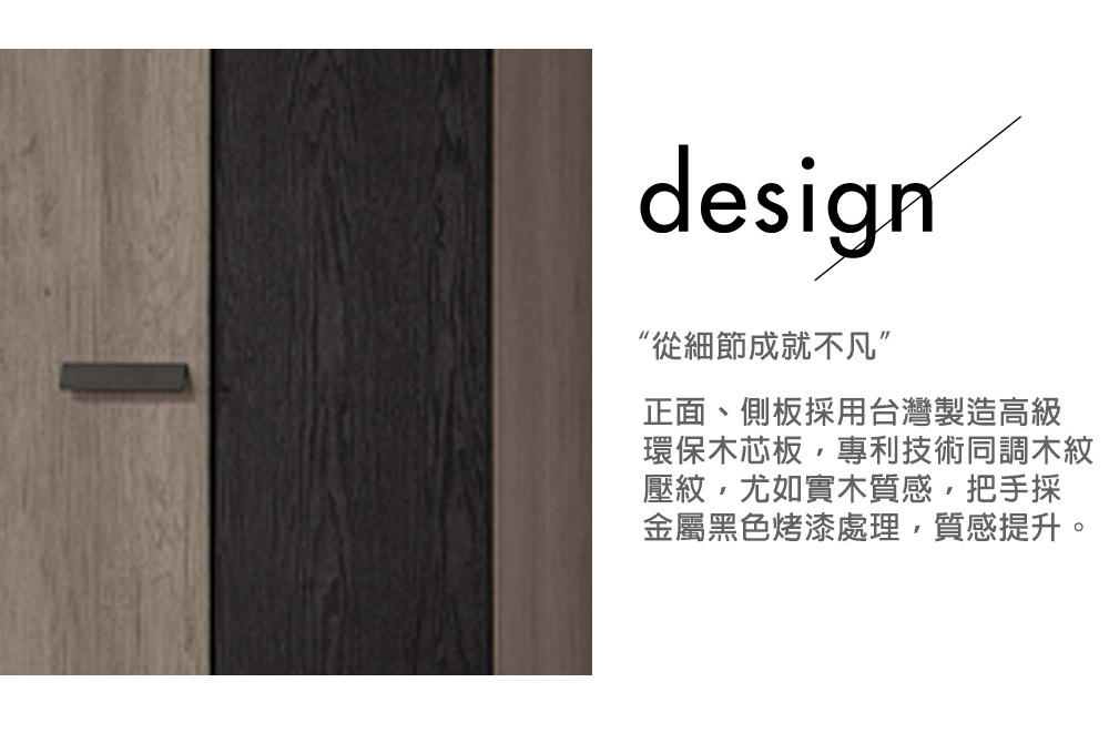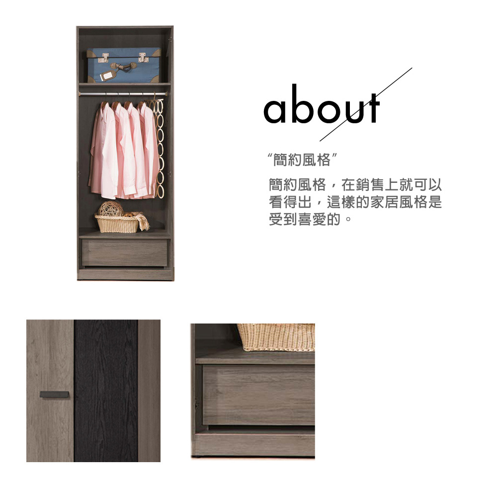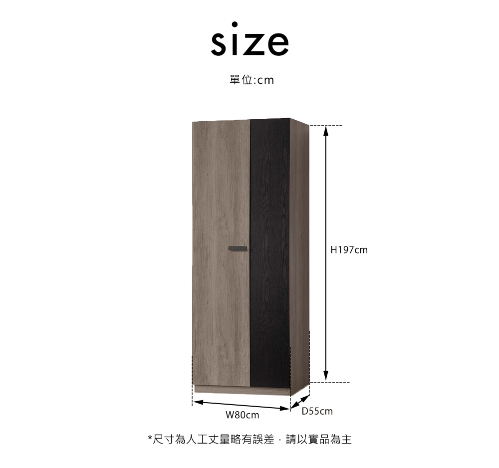 狄恩2.7尺單吊衣櫥尺寸寬80*深55*高197cm材質正面、檯面、側板採用高級環保木心板專利技術同調木紋壓紋,猶如實木質感床頭枕採高級乳膠透氣皮革+高密度泡棉,經手公車縫精緻背板採美背處理把手與腳座採金屬黑色烤漆處理抽屜採台灣製鋼珠滑軌,門片採用油壓緩衝絞鍊