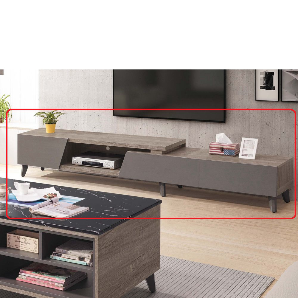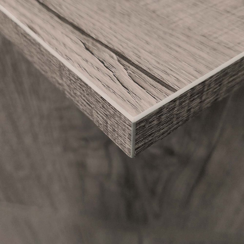材質: 1.正面、檯面、側板為環保木心板經立體木紋+美耐板表面耐磨處理2.抽屜採木心板、實木噴漆腳座3.採1.0mm系統式ABS封邊