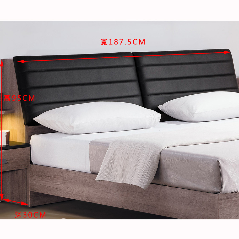 狄恩6尺床頭尺寸寬187.5*深30*高95cm材質正面、檯面、側板採用高級環保木心板專利技術同調木紋壓紋,猶如實木質感床頭枕採高級乳膠透氣皮革+高密度泡棉,經手公車縫精緻背板採美背處理