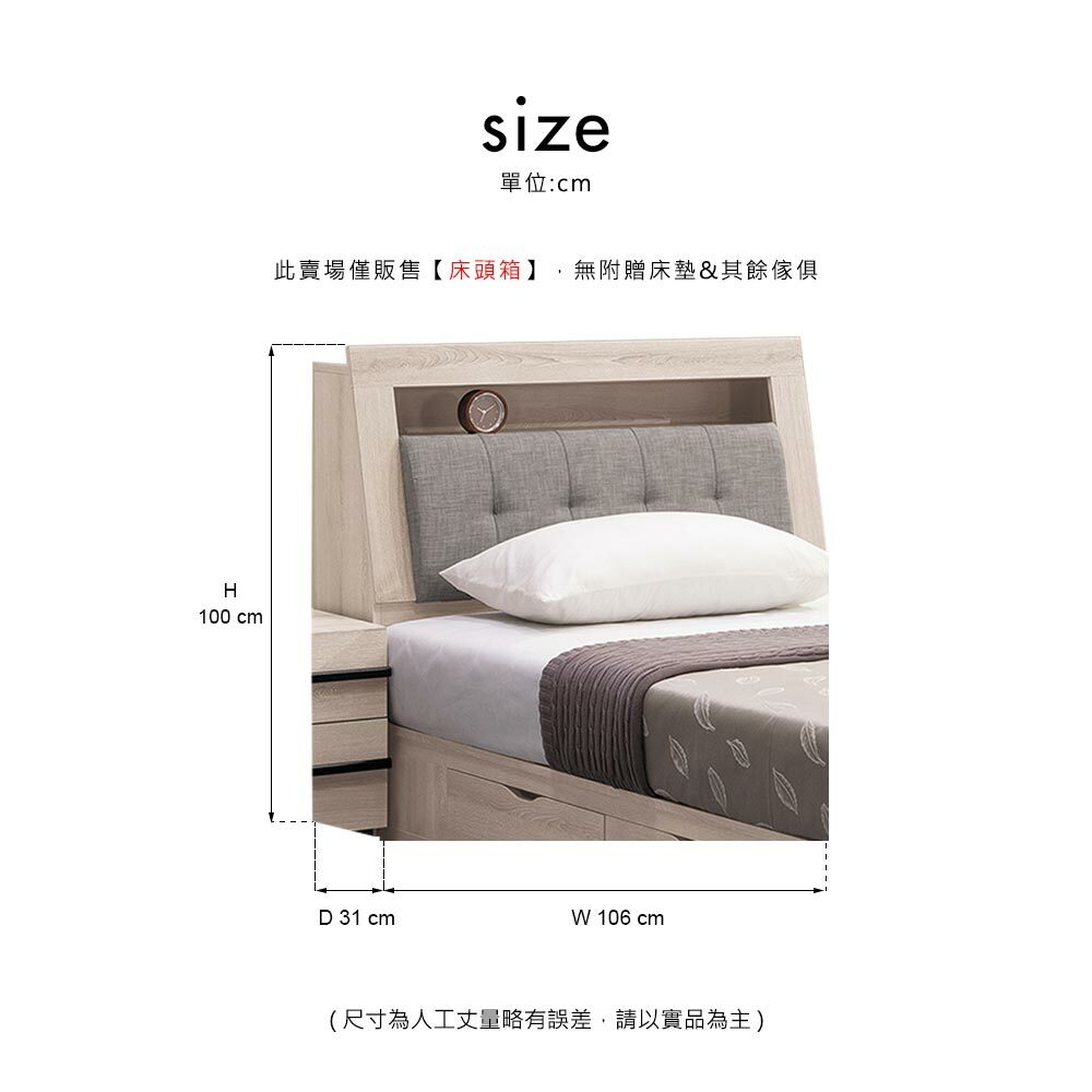 材質: 正面、檯面、側板與抽牆採用高級環保木心板表面處理採用木紋耐磨,猶如實木質感床頭枕採台製防潑水亞麻布+高密度泡棉,經手中精緻車縫處理採實木烤漆把手抽屜採用台灣製鋼珠滑軌,門片採用油壓緩衝鉸鍊背板採用美背處理
