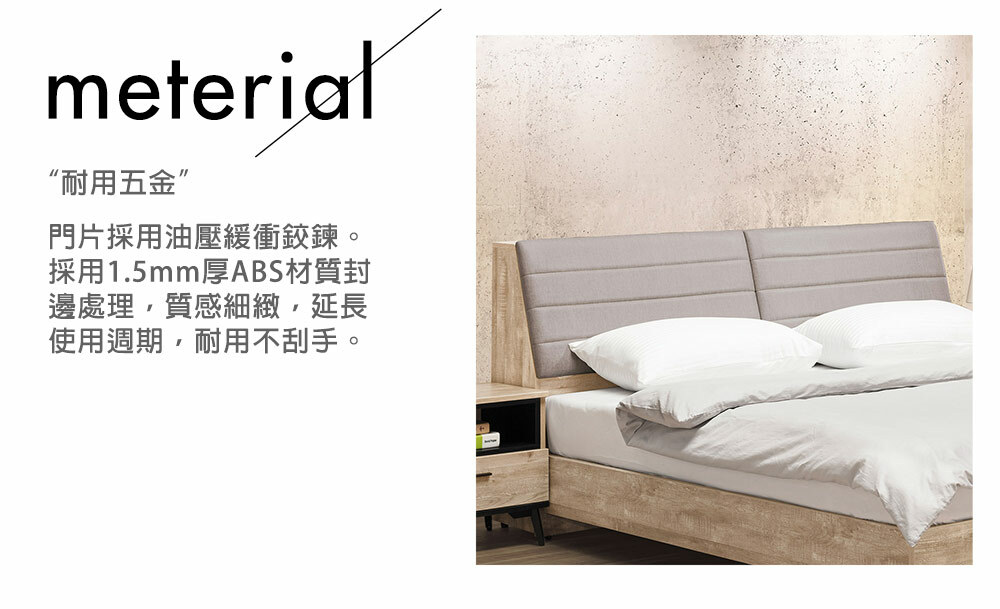 材質: 正面、檯面、側板採用高級環保木心板專利技術同調木紋鋼刷壓紋,猶如實木質感採用系統櫃1.5mm厚abs材質封邊處理,質感細緻延長使用週期,具環保(可回收)、耐衝擊、耐磨性、高鋼性特質背板採用美背處理門片採用油壓緩衝鉸鍊