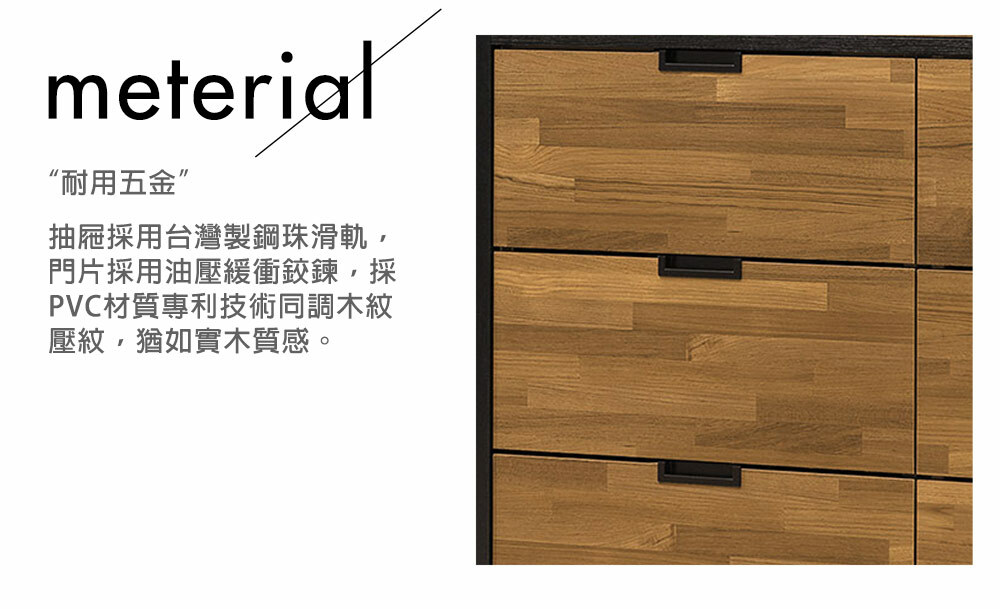材質: 正面、側板採用高級環保木心板採PVC材質專利技術同調木紋壓紋把手採金屬黑色烤漆處理抽屜採用台灣製鋼珠滑軌門片採用油壓緩衝後鈕美背處理