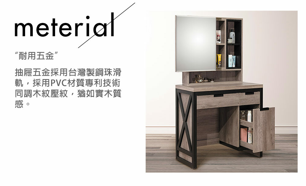 材質: 正面、側板採用高級環保木心板採PVC材質專利技術同調木紋壓紋把手採金屬黑色烤漆處理抽屜採用台灣製鋼珠滑軌美背處理