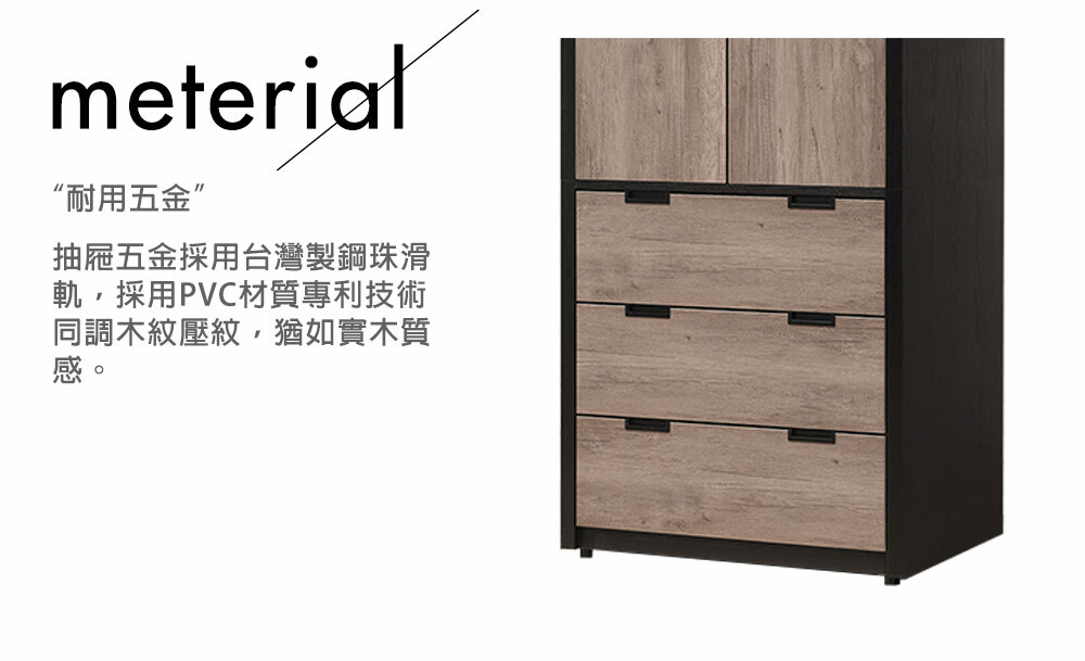 材質: 正面、側板採用高級環保木心板採PVC材質專利技術同調木紋壓紋把手採金屬黑色烤漆處理抽屜採用台灣製鋼珠滑軌門片採用油壓緩衝後鈕美背處理