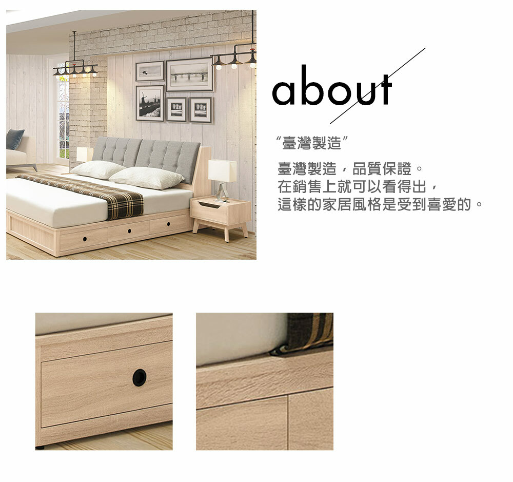 材質: 正面、側板採用高級環保木心板專利技術同調木紋鋼刷壓紋,猶如實木質感抽屜採用台灣製鋼珠滑軌美背處理本賣場床底為雙面六抽床底
