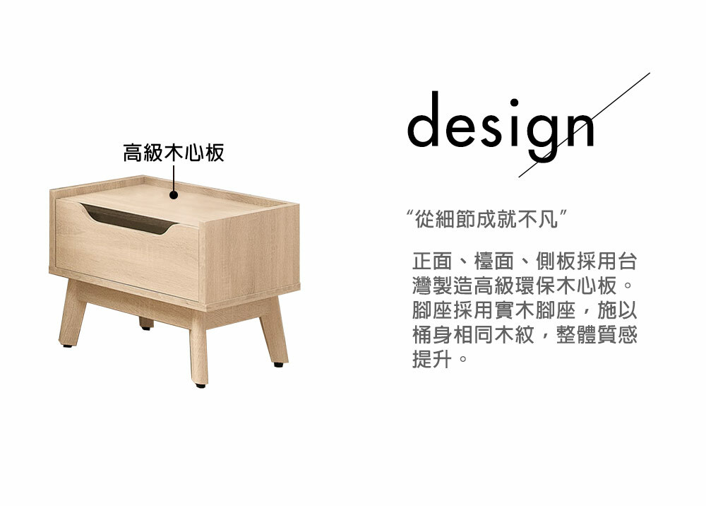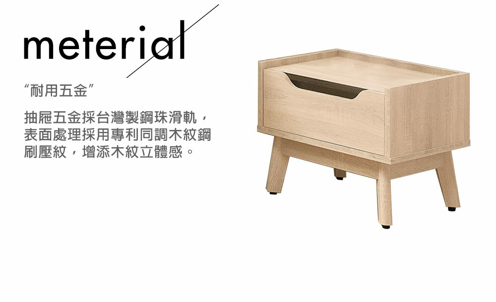 材質: 正面、側板採用高級環保木心板專利技術同調木紋鋼刷壓紋,猶如實木質感腳座採實木製腳座,施以桶身箱同木紋,整體質感提升抽屜採用台灣製鋼珠滑軌美背處理