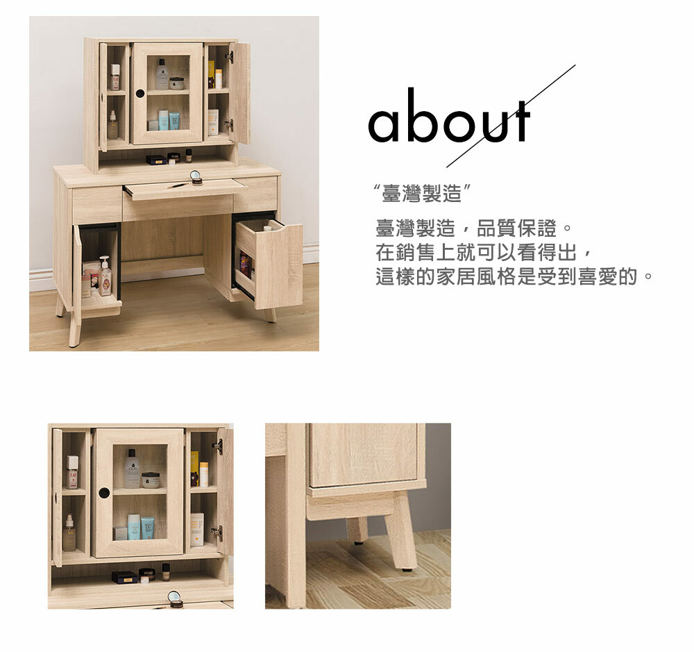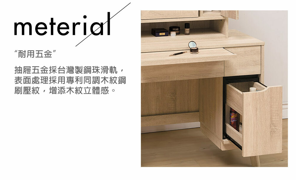 材質: 正面、側板採用高級環保木心板專利技術同調木紋鋼刷壓紋,猶如實木質感腳座採實木製腳座,施以桶身箱同木紋,整體質感提升抽屜採用台灣製鋼珠滑軌美背處理