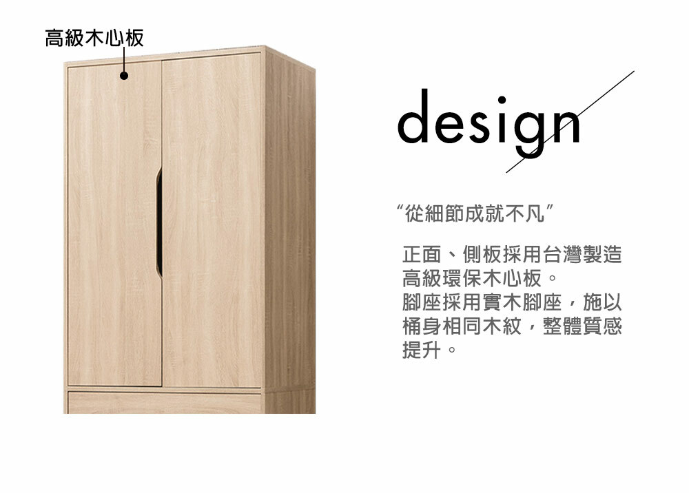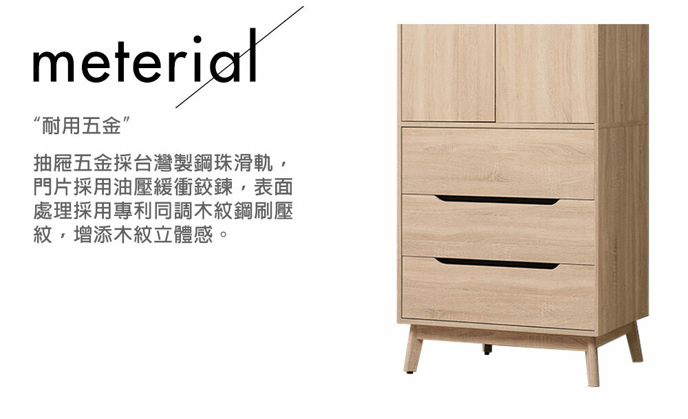 材質: 正面、側板採用高級環保木心板專利技術同調木紋鋼刷壓紋,猶如實木質感腳座採實木製腳座,施以桶身箱同木紋,整體質感提升抽屜採用台灣製鋼珠滑軌、門片採用油壓鉸鍊美背處理
