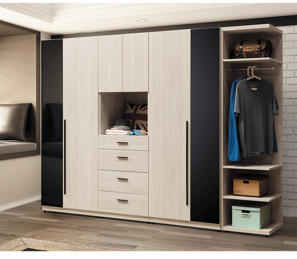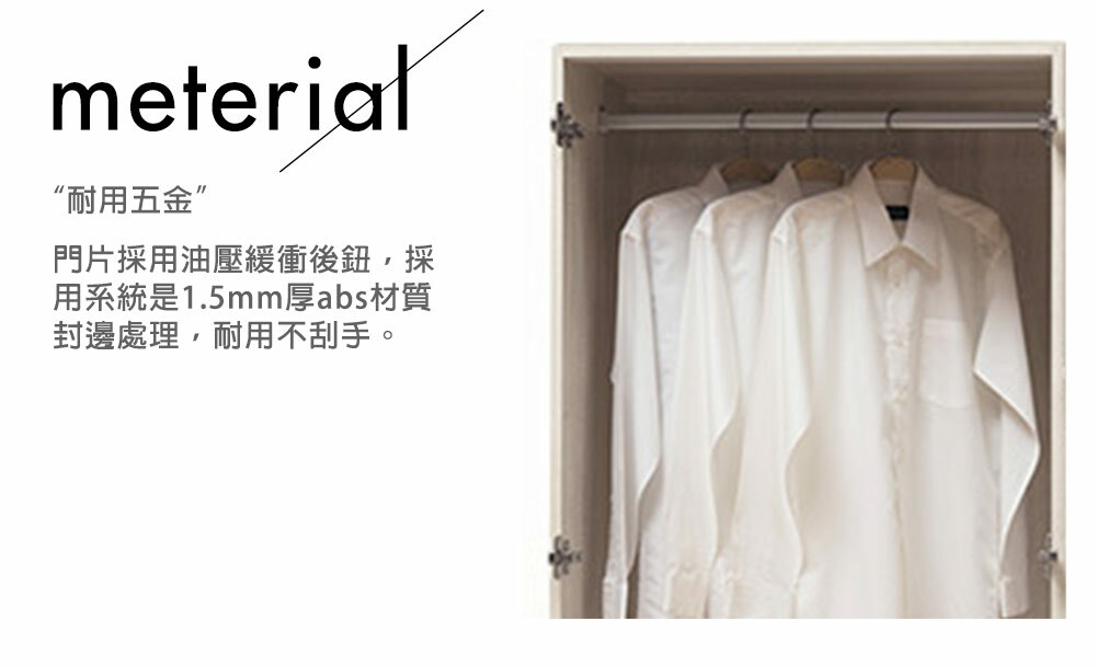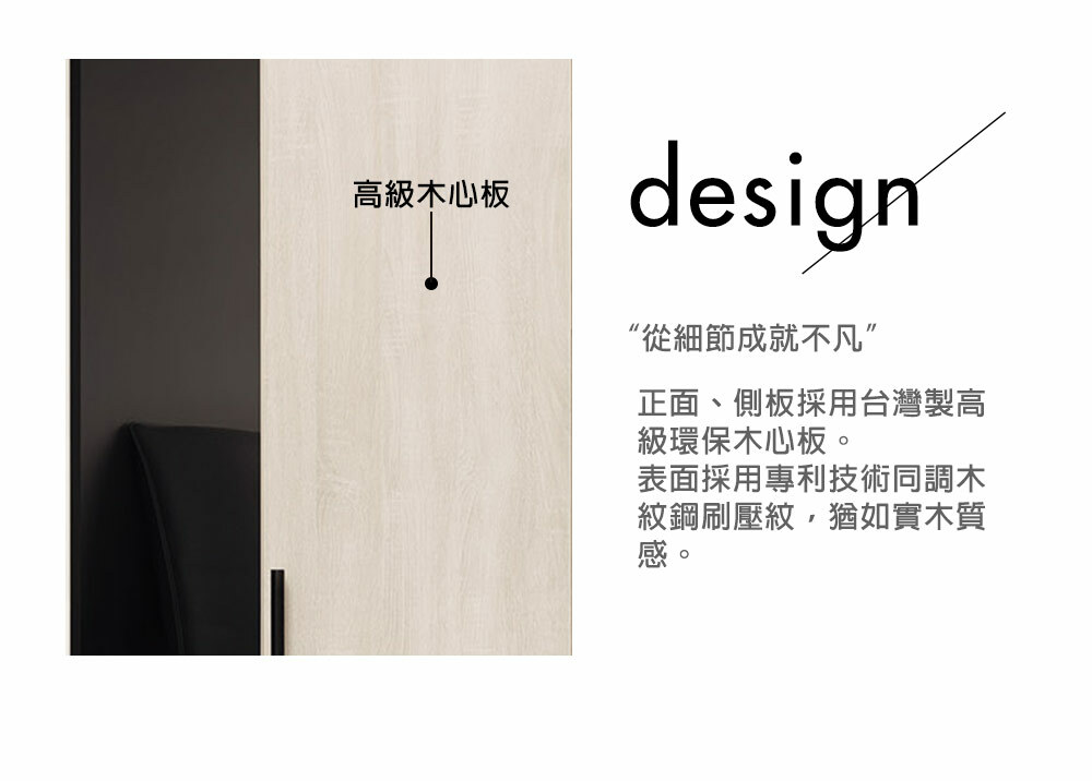 材質: 正面、側板採用高級環保木心板專利技術同調木紋鋼刷壓紋,猶如實木質感採用系統式1.5mm厚ABS材質封邊處理,質感細緻門片採用油壓緩衝後鈕衣櫥門片為3mm強化玻璃,採斜邊烤黑漆處理美背處理此賣場僅販售2.5尺雙吊衣櫃,不包含其他衣櫃及飾品
