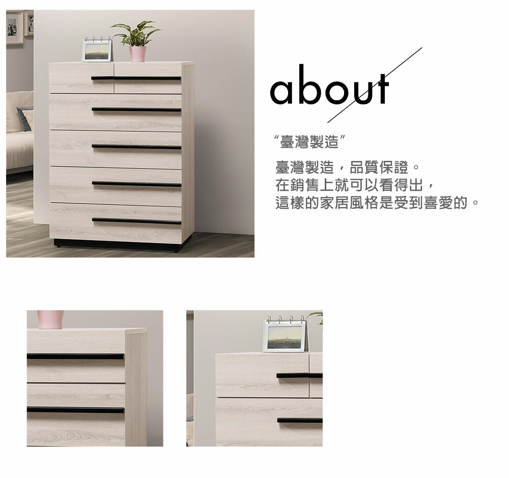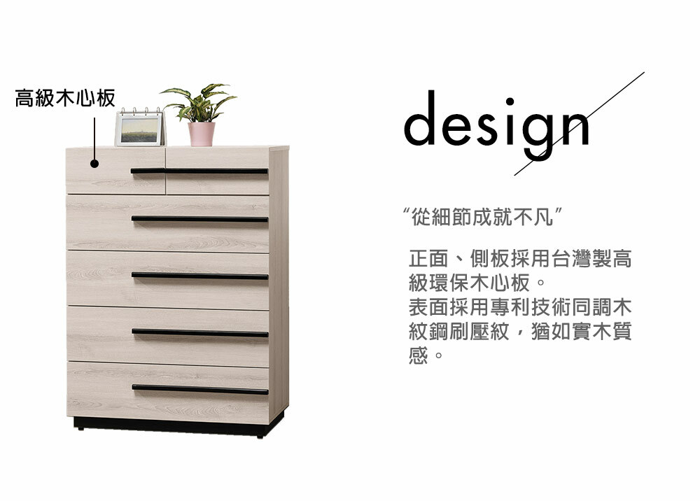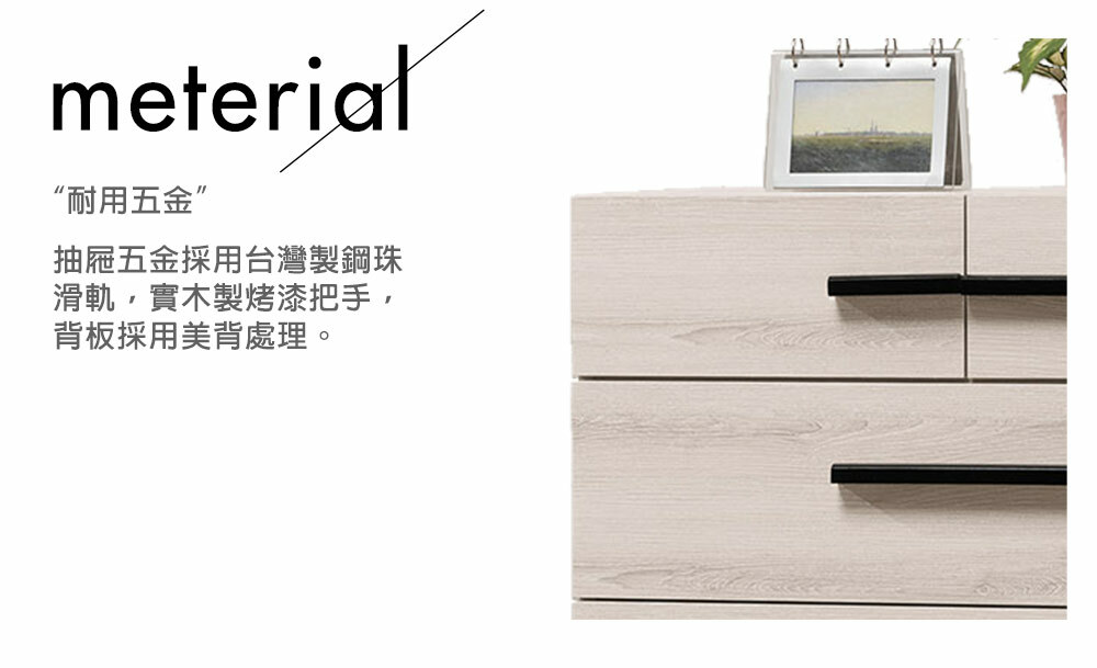 材質: 正面、側板採用高級環保木心板專利技術同調木紋鋼刷壓紋,猶如實木質感抽屜五金採用台灣製鋼珠滑軌美背處理