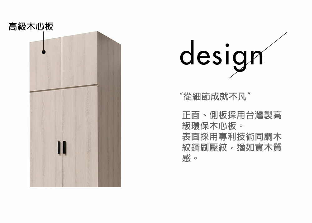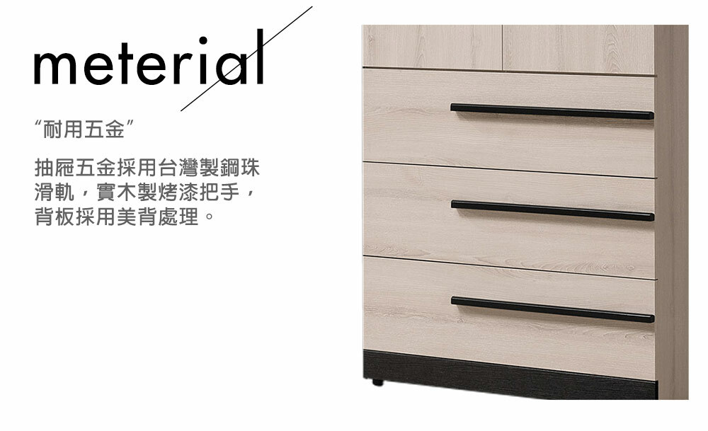 材質: 正面、側板採用高級環保木心板專利技術同調木紋鋼刷壓紋,猶如實木質感門片採用油壓緩衝鉸鍊抽屜五金採用台灣製鋼珠滑軌美背處理