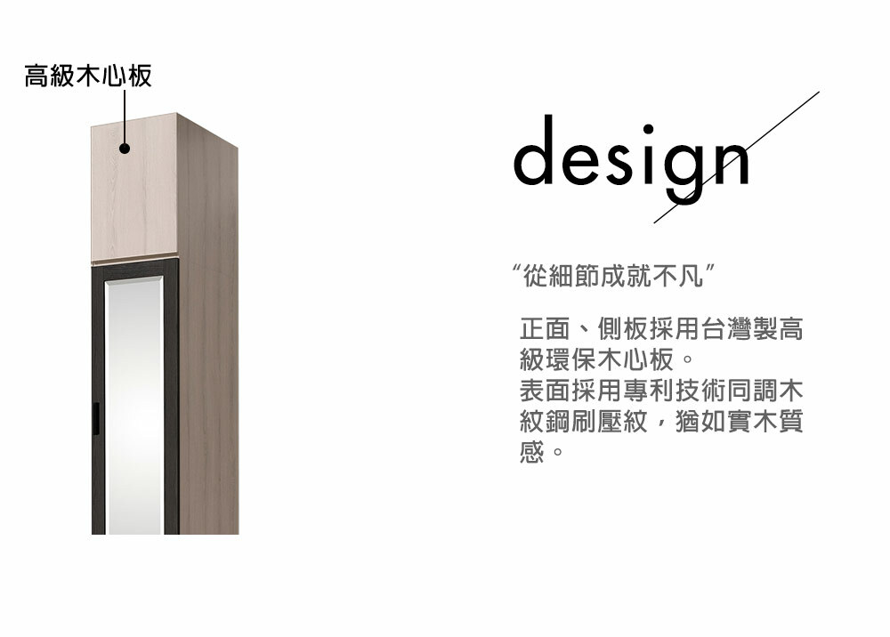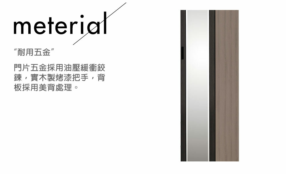 材質: 正面、側板採用高級環保木心板專利技術同調木紋鋼刷壓紋,猶如實木質感門片採用油壓緩衝鉸鍊美背處理