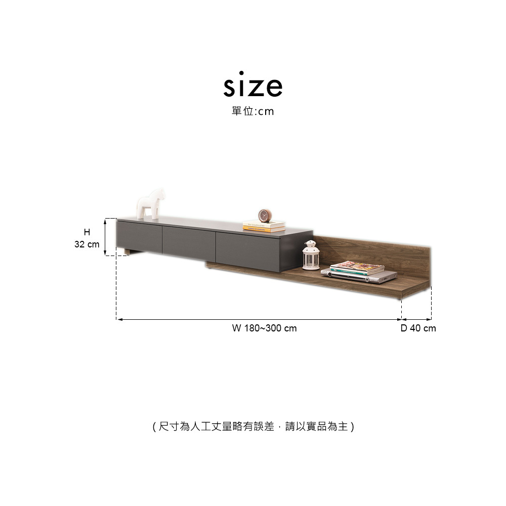 尺寸: 寬180x深40x高32cm(伸縮: 180~300cm)