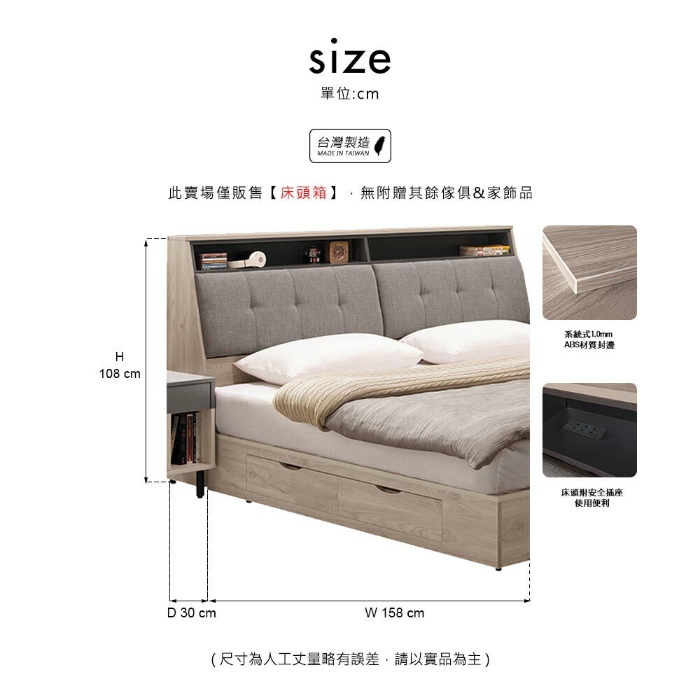 材質: 正面、檯面、側板與抽牆採用高級環保木心板專利技術同調木紋鋼刷壓紋,猶如實木質感床頭枕採台製防潑水亞麻布+高密度泡棉,經手中精緻車縫處理採用系統式1.0mm厚ABS材質封邊處理,質感細膩;延長使用週期,具環保可回收、耐衝擊、耐磨性、高鋼性特質抽屜採用台灣製鋼珠滑軌,門片採用油壓緩衝鉸鍊背板採用美背處理