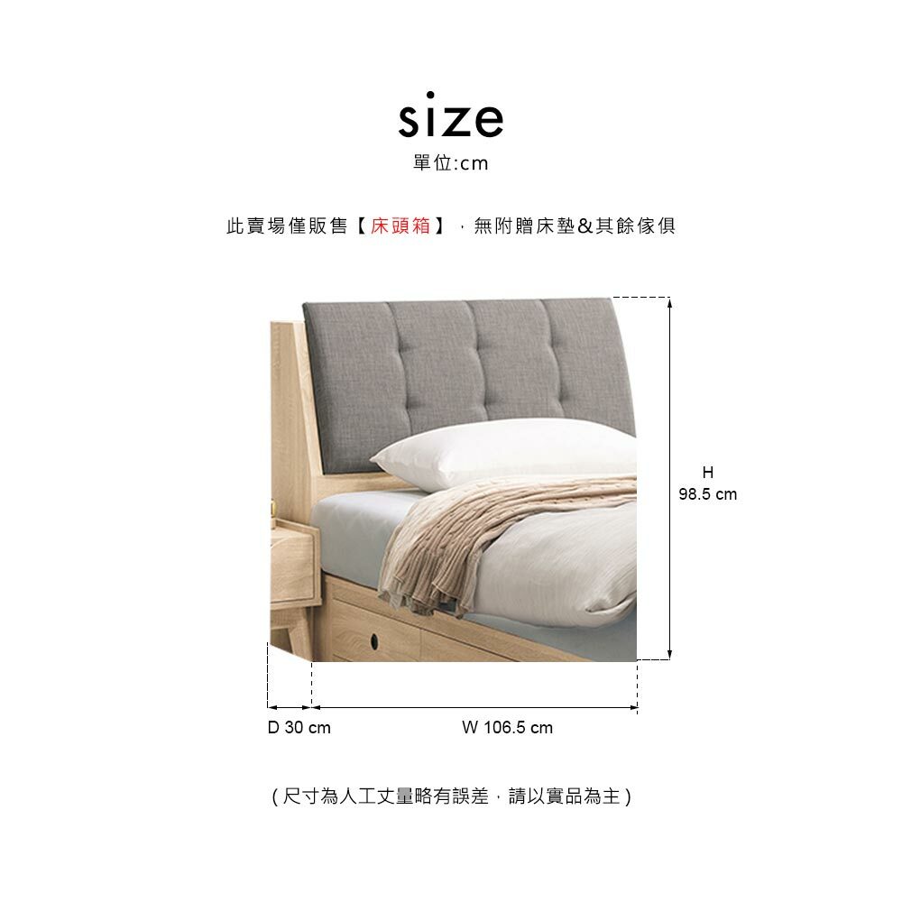 材質: 正面、檯面、側板與抽牆採用高級環保木心板專利技術同調木紋鋼刷壓紋,猶如實木質感床頭枕採台製防潑水亞麻布+高密度泡棉,經手中精緻車縫處理抽屜採用台灣製鋼珠滑軌,門片採用油壓緩衝鉸鍊實木腳座,施以桶身相同木紋,整體質感提升背板採用美背處理