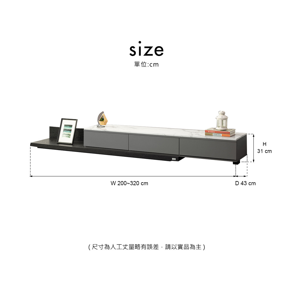 尺寸: 寬200x深43x高31cm(伸縮: 200~320cm)