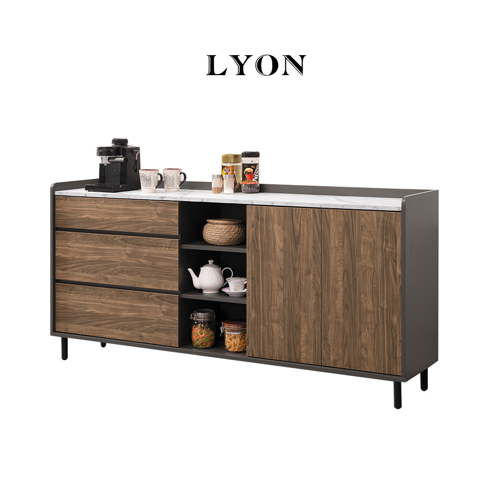 材質: 正面、檯面、側板為環保木心板經立體木紋耐磨桌面採木心板美耐皿耐熱石紋採系統式1.0mmABS厚封邊處理,質感加分採高12cm金屬圓管腳座,經黑色粉體烤漆抽屜鋼珠滑軌,門片採緩衝鉸鍊