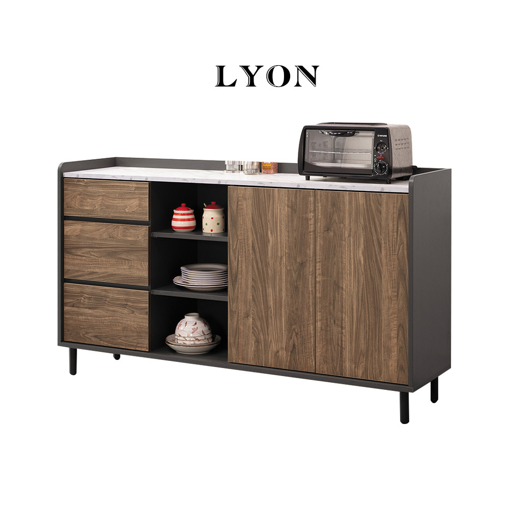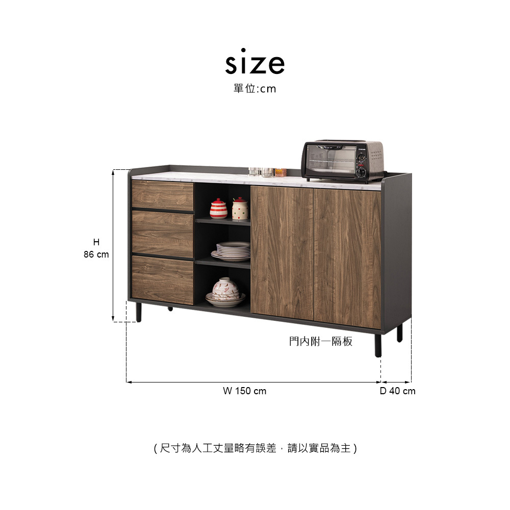 材質: 正面、檯面、側板為環保木心板經立體木紋耐磨桌面採木心板美耐皿耐熱石紋採系統式1.0mmABS厚封邊處理,質感加分採高12cm金屬圓管腳座,經黑色粉體烤漆抽屜鋼珠滑軌,門片採緩衝鉸鍊