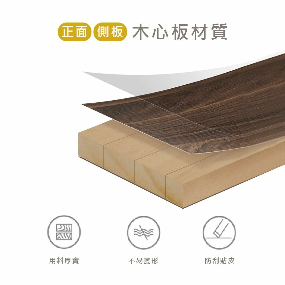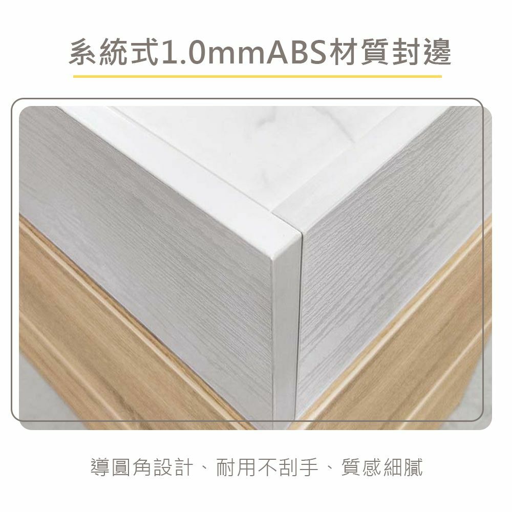 材質: 正面、檯面、側板木心板材質專利技術同調木紋鋼刷壓紋,猶如實木質感採系統式1.0mmABS厚封邊處理,質感加分採6mm鏡面門片,油壓緩衝鉸鍊背板採美背處理