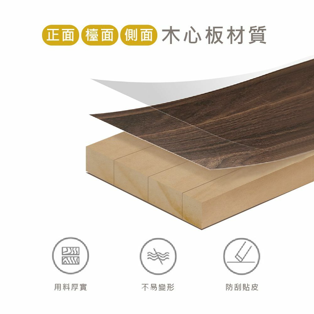 材質: 1.正面、檯面、側板為環保木心板經立體木紋耐磨處理2.抽屜採木心板3.採1.0mm系統式ABS封邊