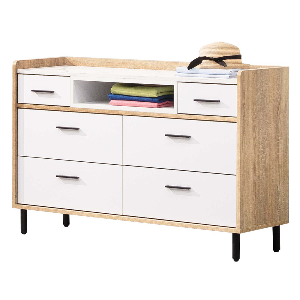 材質: 採用高級環保木心板專利技術同調木紋鋼刷壓紋,猶如實木質感美耐皿石紋材質,具耐磨、耐熱特性採用ABS材質封邊處理,質感細緻抽屜採用台灣製鋼珠滑軌採高12cm金屬腳座,經黑色粉體烤漆處理