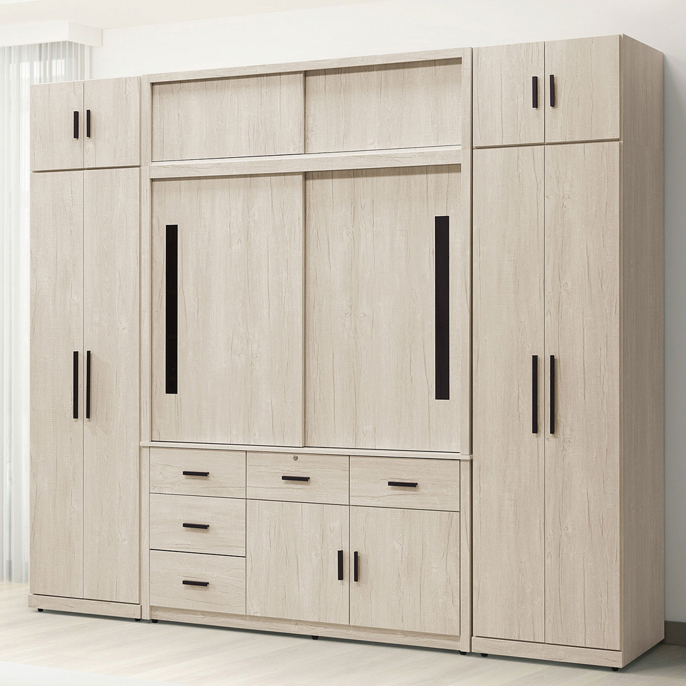 尺寸:寬272x深58x高240(公分)材質:採用符合低甲醛浮雕耐磨木心板床台、床片皮墊: 採用貓抓皮,附雙插頭雙USB3.1床底: 四面噴砂鐵架框。五金: 把手為鐵製黑色烤漆腳架: 噴砂鐵腳. 高度12cm抽屜: 採高級鋼珠滑軌鉸鍊: 緩衝油壓鉸鍊背板: 釘附式美背處理其他說明:僅販售標示家具,不包含其他飾品