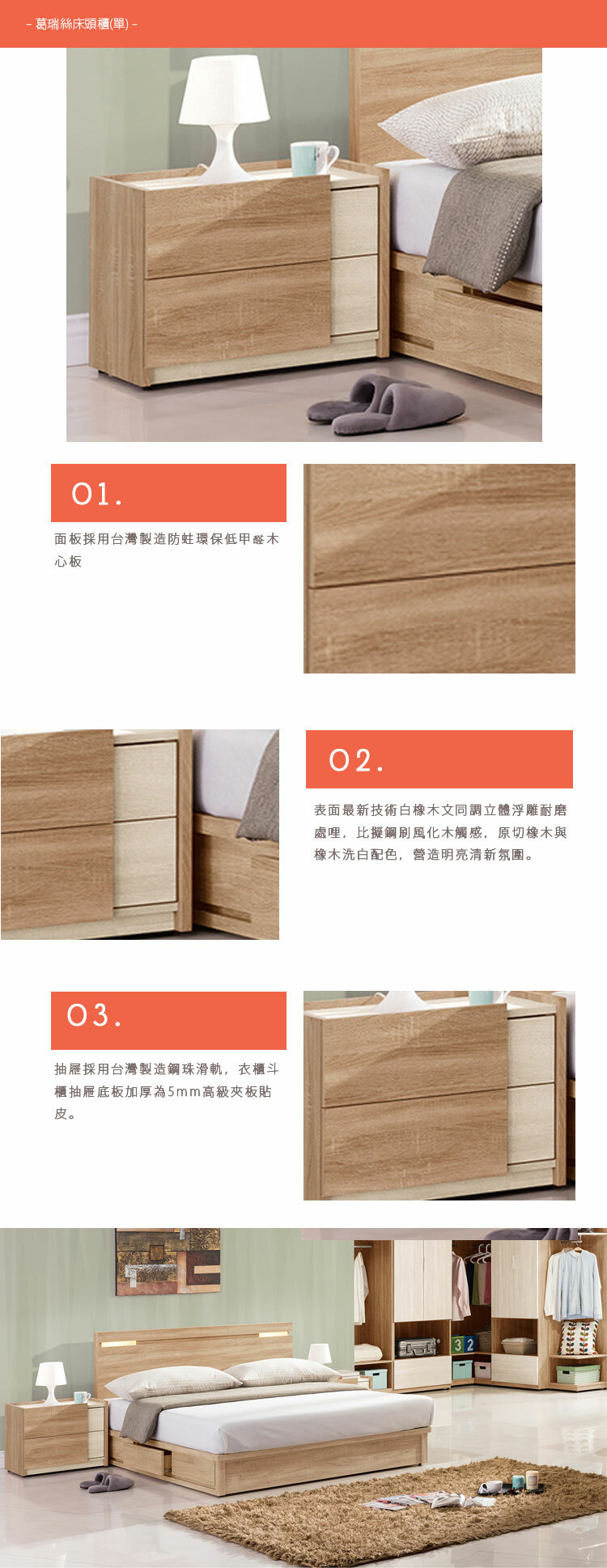 材質:正面、側面、面板採用台灣製造防蛀環保低甲醛木心板,表面最新技術白橡木紋同調立體浮雕耐磨處哩,比擬鋼刷風化木觸感,原切橡木與橡木洗白配色,營造明亮清新氛圍。