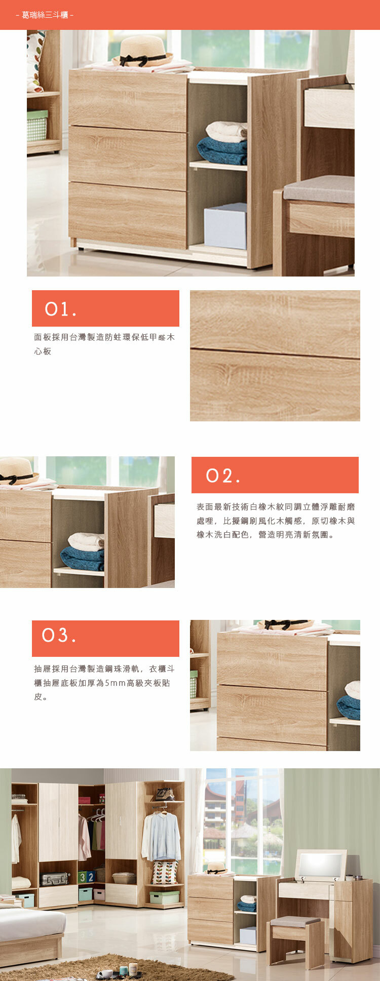 抽屜:採用台灣製造鋼珠滑軌,衣櫃斗櫃抽屜底板加厚為5mm高級夾板貼皮。