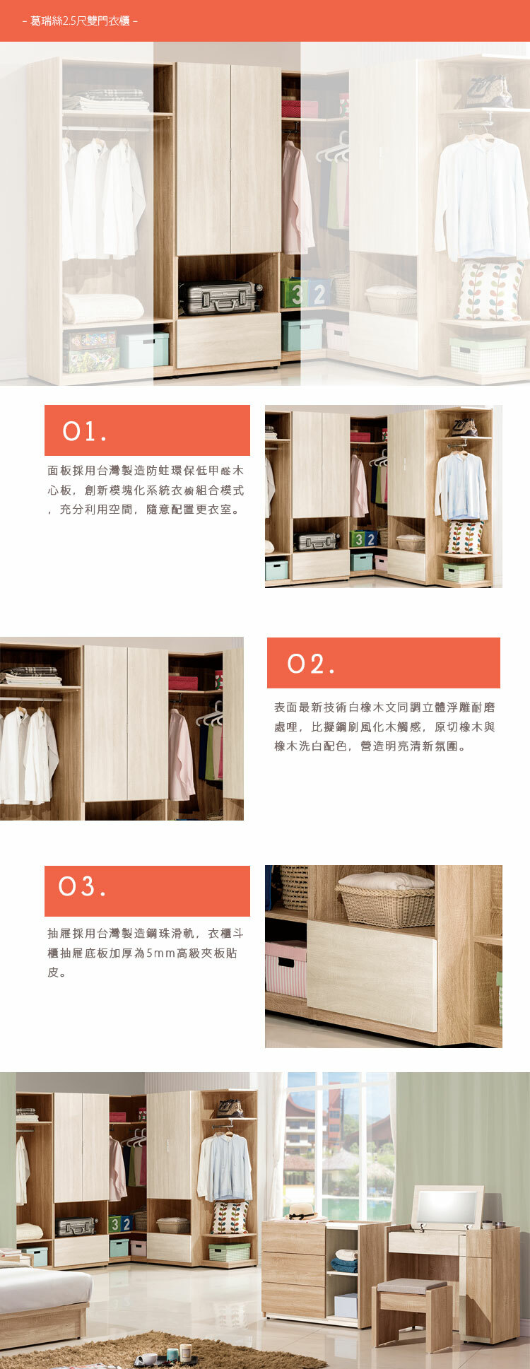 抽屜:採用台灣製造鋼珠滑軌,衣櫃斗櫃抽屜底板加厚為5mm高級夾板貼皮。