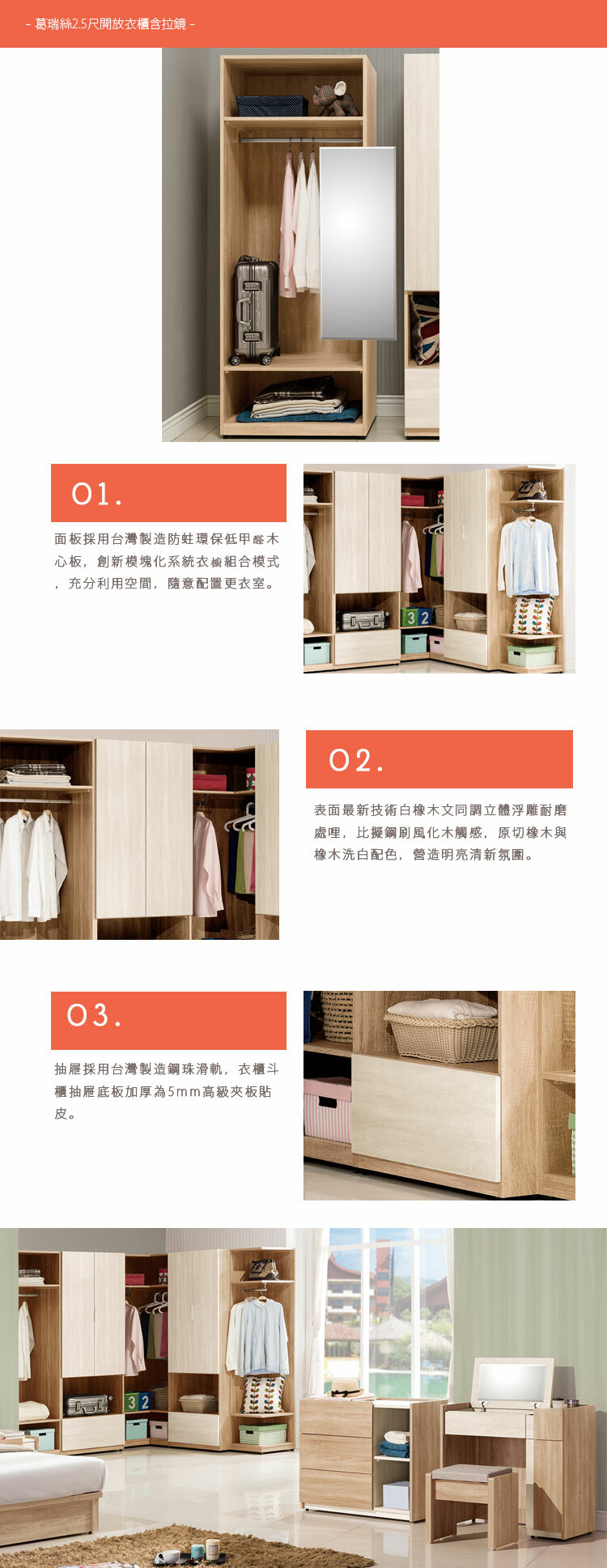 抽屜:採用台灣製造鋼珠滑軌,衣櫃斗櫃抽屜底板加厚為5mm高級夾板貼皮。