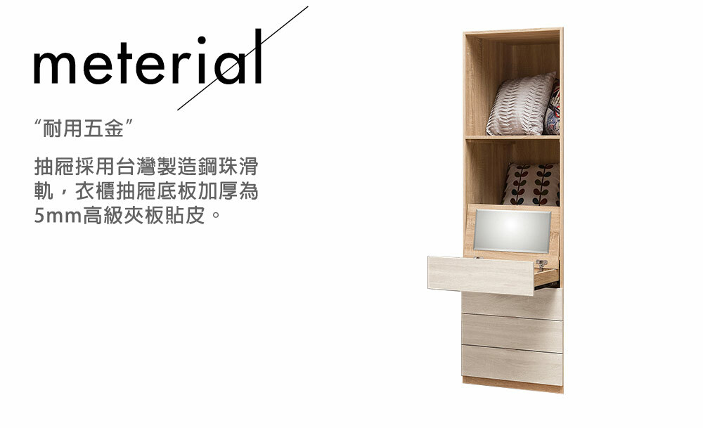 抽屜採用台灣製造鋼珠滑軌,衣櫃抽屜底板加厚為5mm高級夾板貼皮